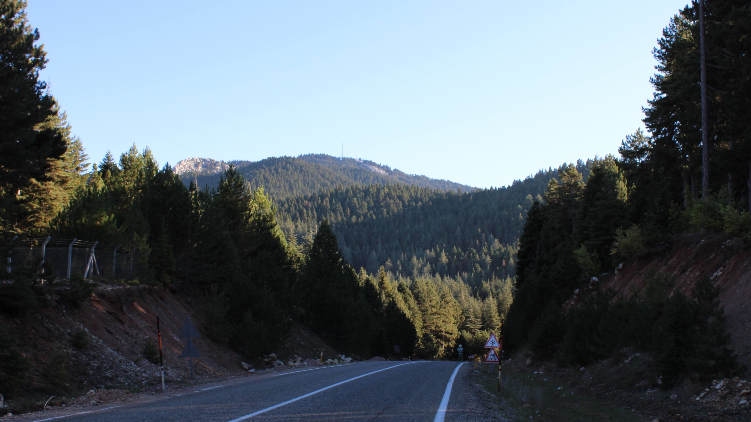 Entdecken Sie die atemberaubende Landschaft mit einer Straße, die durch dichten Kiefernwald in Kahramanmaras, Türkei, führt. Perfekt für Naturliebhaber und Fotografie-Enthusiasten.
